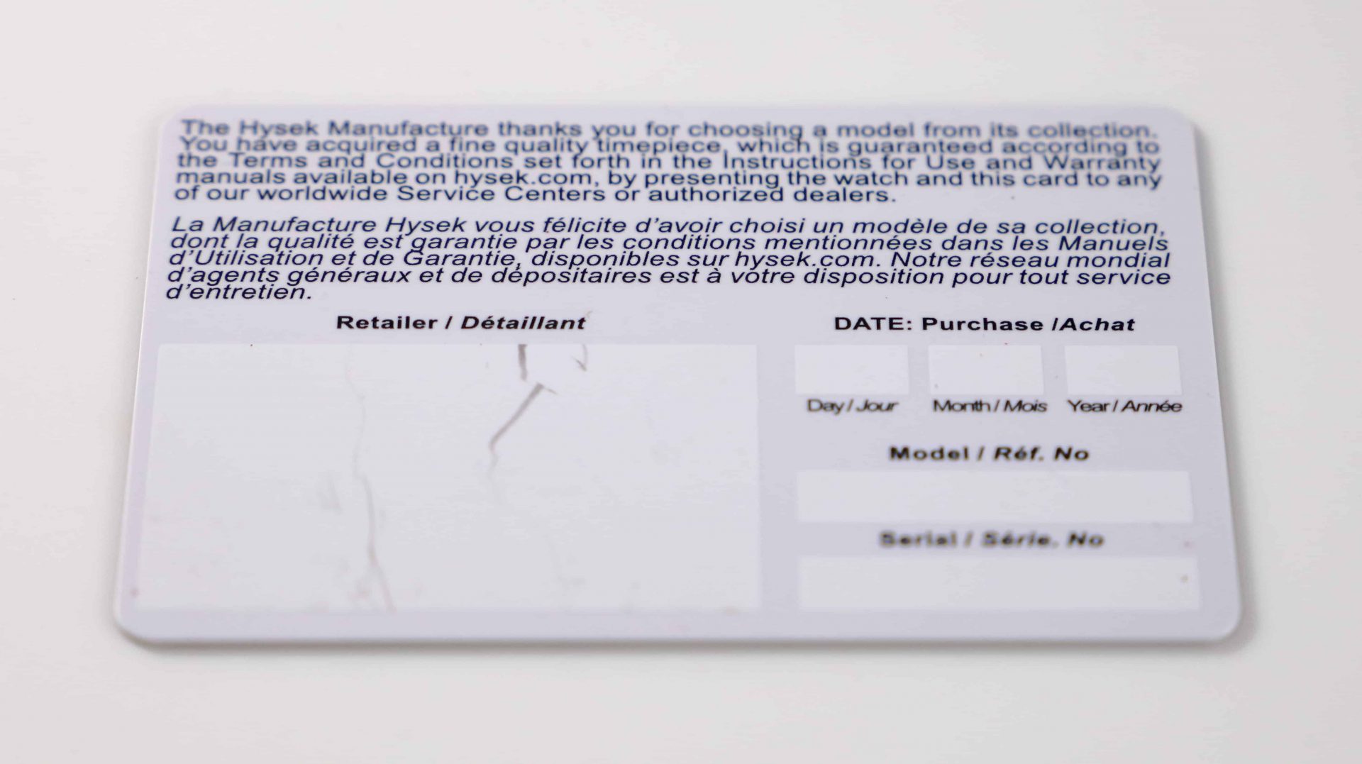 Hysek Watch Warranty Guarantee Card
